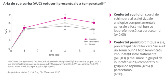 Reducerea febrei cu ibuprofen a fost semnificativ mai mare decât la paracetamol sau aspirină și a avut rezultate mai bune în ceea ce privește confortul părinților4