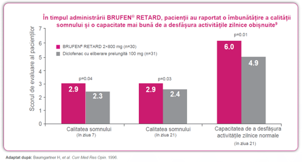 BRUFEN® RETARD a demonstrat o îmbunătățire semnificativă statistic în scorurile de durere, atât pe timpul zilei, cât și pe parcursul nopţii.9