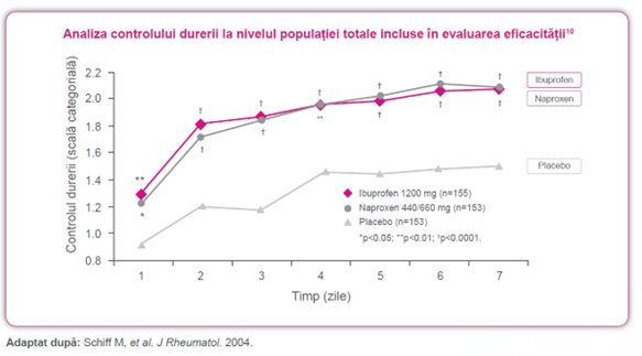 - Ibuprofen și naproxen s-au dovedit eficiente inclusiv la pacienții cu vârsta ≥65 de ani, cu aceeași formă de osteoartrită.10